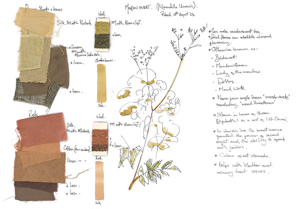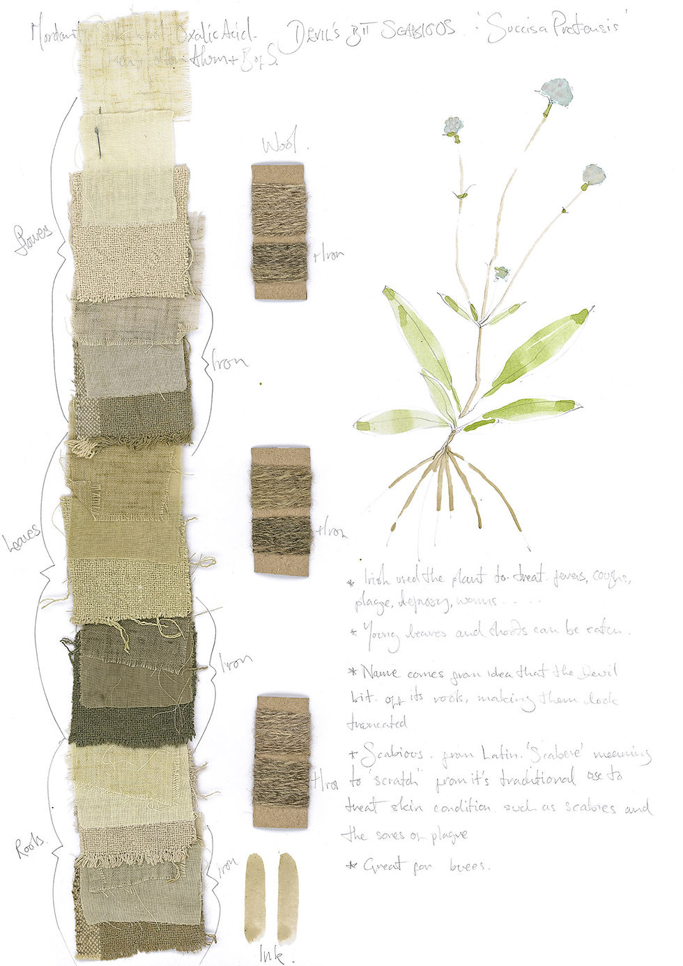 To do this, Sarah is embarking on a vast project: she's extracting dye from every plant on her croft. She meticulously dyes swatches of wool, cotton, linen, and silk, then modifies half of her swatches with iron.